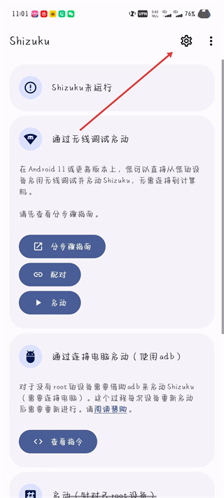 1、打開Shizuku應(yīng)用,點(diǎn)擊設(shè)置圖標(biāo),進(jìn)入設(shè)置頁面。