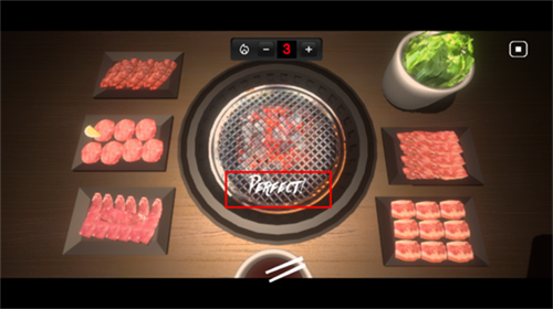 1、烤肉模擬器的玩法很簡單,和我們?nèi)粘?救獾牟僮鲙缀跻粯?,十分還原,游戲屏幕上方的“-、+”標(biāo)志是可以調(diào)整火候大小,如下圖紅框所示,想要烤出美味的烤肉,火候一定要掌握好;
