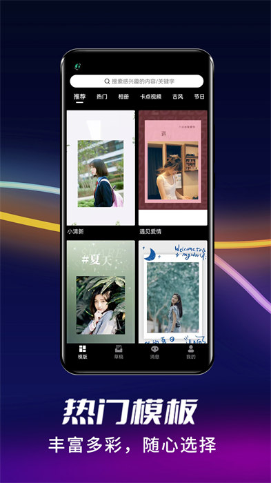 ③、創(chuàng)意模版,根據(jù)需要更改文字、圖片或視頻素材,即可快速制作出令人驚艷的視頻作品;