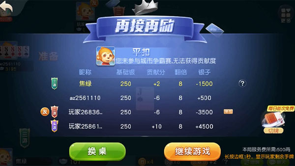 4、出牌完成之後遊戲結(jié)束,可以選擇換桌或者繼續(xù)遊戲。