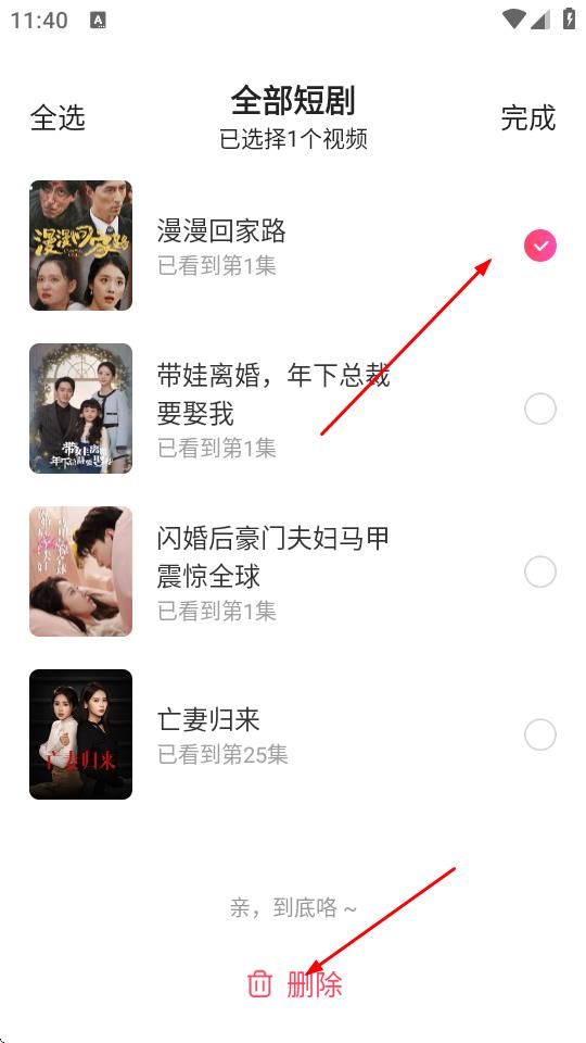 4、在全部短劇頁面,勾選要刪除記錄的短劇,點擊底部的刪除按鈕即可。