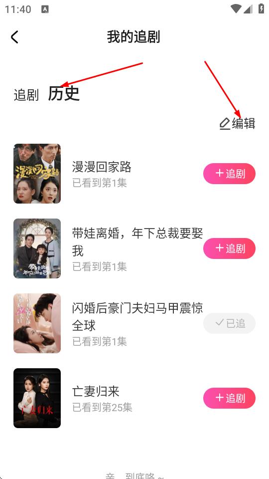 3、進入我的追劇頁面后,點擊歷史標簽,再點擊編輯。