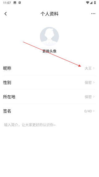 3、在個人資料界面里找到昵稱選項,點擊當前顯示的昵稱內(nèi)容進入昵稱編輯頁面。