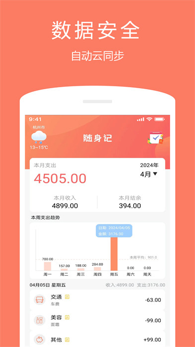 隨身記溫暖記賬app是一款非常好用的線上記錄軟件,其中能夠將用戶日常飲食、服裝等等生活開支記錄的非常清晰,并且這些數(shù)據(jù)都能通過文檔的方式導出進行詳細查看,同時還能給出更加合理的改善建議,幫助用戶養(yǎng)成良好的消費習慣。