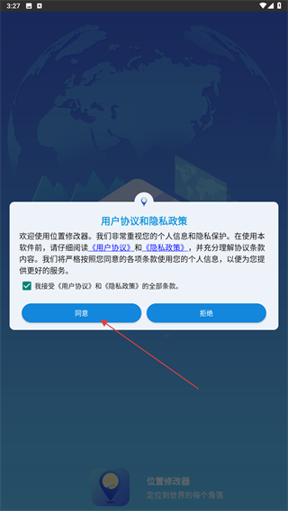 1、啟動位置修改器的應(yīng)用軟件,進(jìn)入時會跳出隱私政策,勾選后點擊同意的按鈕。