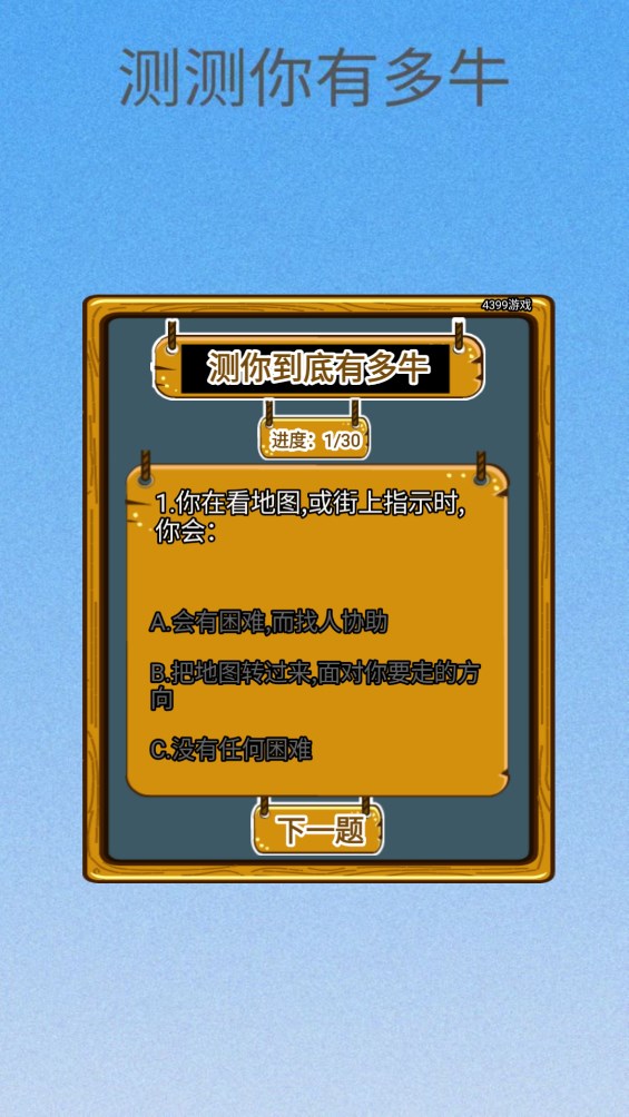 測測你有多牛游戲是一款以文字答題類為主的游戲,面對一些喜愛測試游戲的玩家來說該游戲在挑戰(zhàn)上更是具有一定的準(zhǔn)確性,所以面對該作品中可以了解到不同的一直答題挑戰(zhàn),面對各種測試題中會有多個不同的題目需要回答,越貼近自己第一感覺的回答在結(jié)局會有更符合自己的答案內(nèi)容,所以在這里測試挑戰(zhàn)中更是為各位帶來全新的特色挑戰(zhàn),享受不一樣的新穎有趣的玩法體驗,在這測試自己的智慧或者一些習(xí)慣,讓測試的最終結(jié)果下能看到最真實的自己。