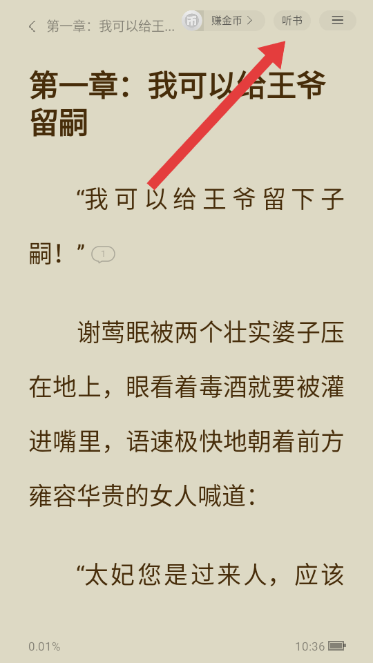 2、在小說(shuō)閱讀界面,點(diǎn)擊右上角的聽(tīng)書(shū)按鈕,切換到聽(tīng)書(shū)的模式。
