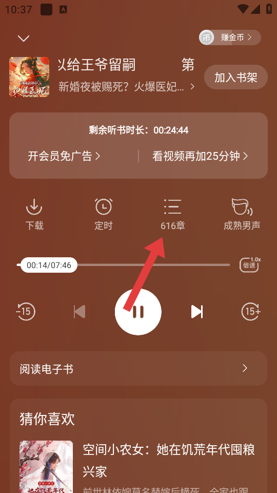 3、在聽(tīng)書(shū)的界面,點(diǎn)擊616章目錄按鈕,打開(kāi)小說(shuō)的章節(jié)列表。
