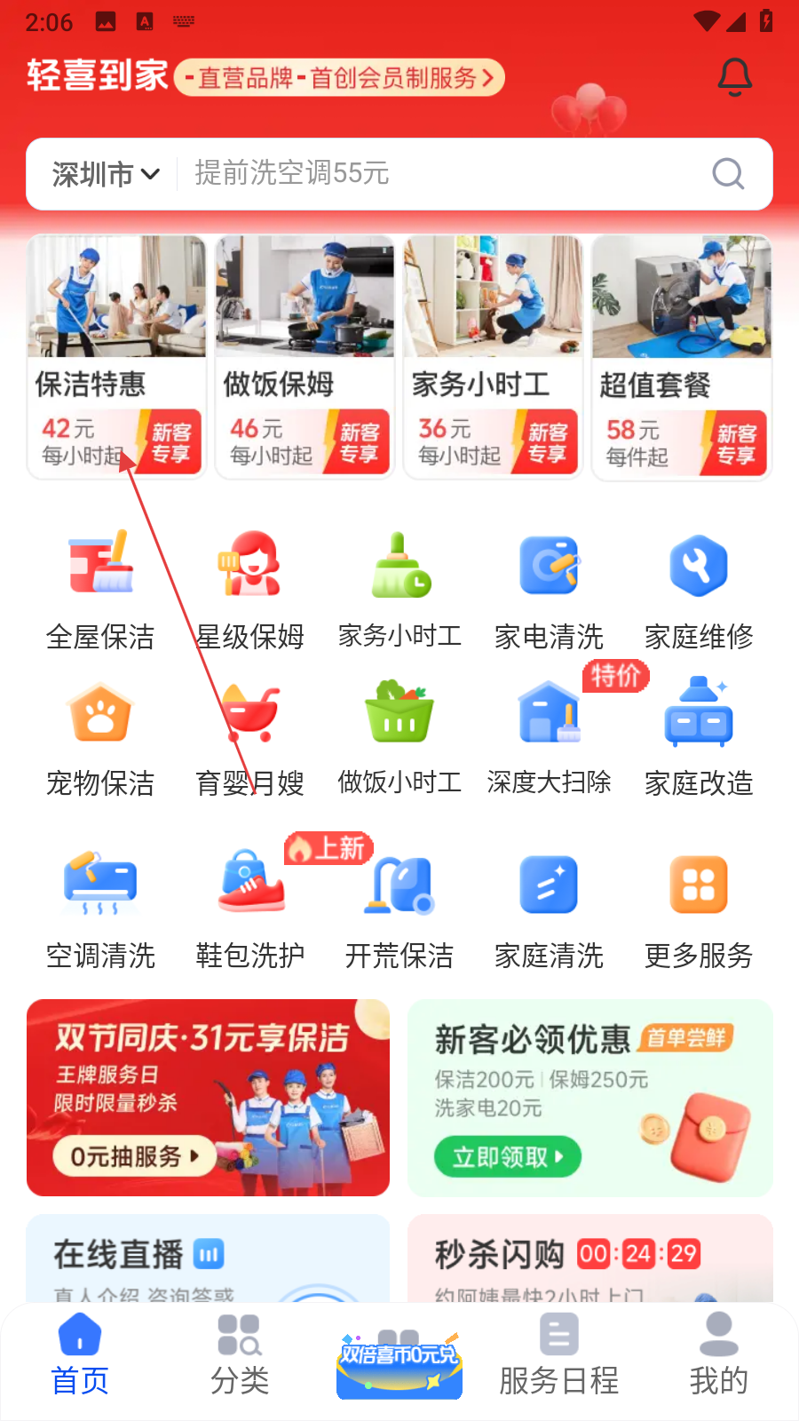 1、打開輕喜到家APP,在首頁找到想要拼團的服務(wù),點擊進入該服務(wù)的詳情頁面。