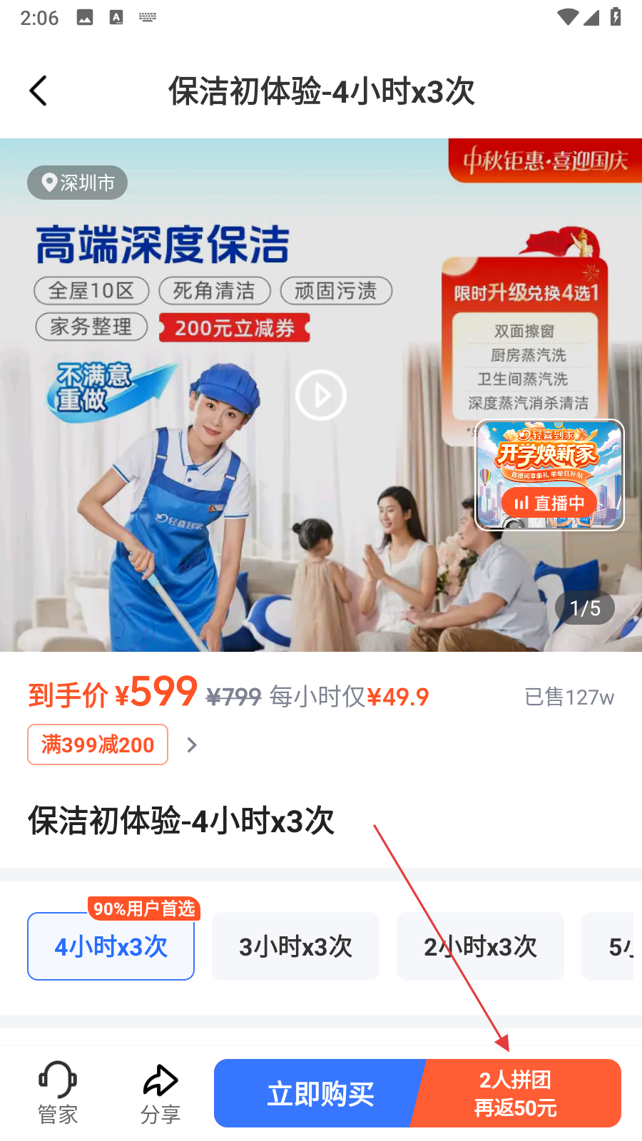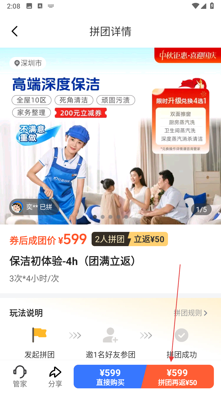 2、在服務(wù)詳情頁面,點擊2人拼團再返50元按鈕,進入拼團詳情頁面。
