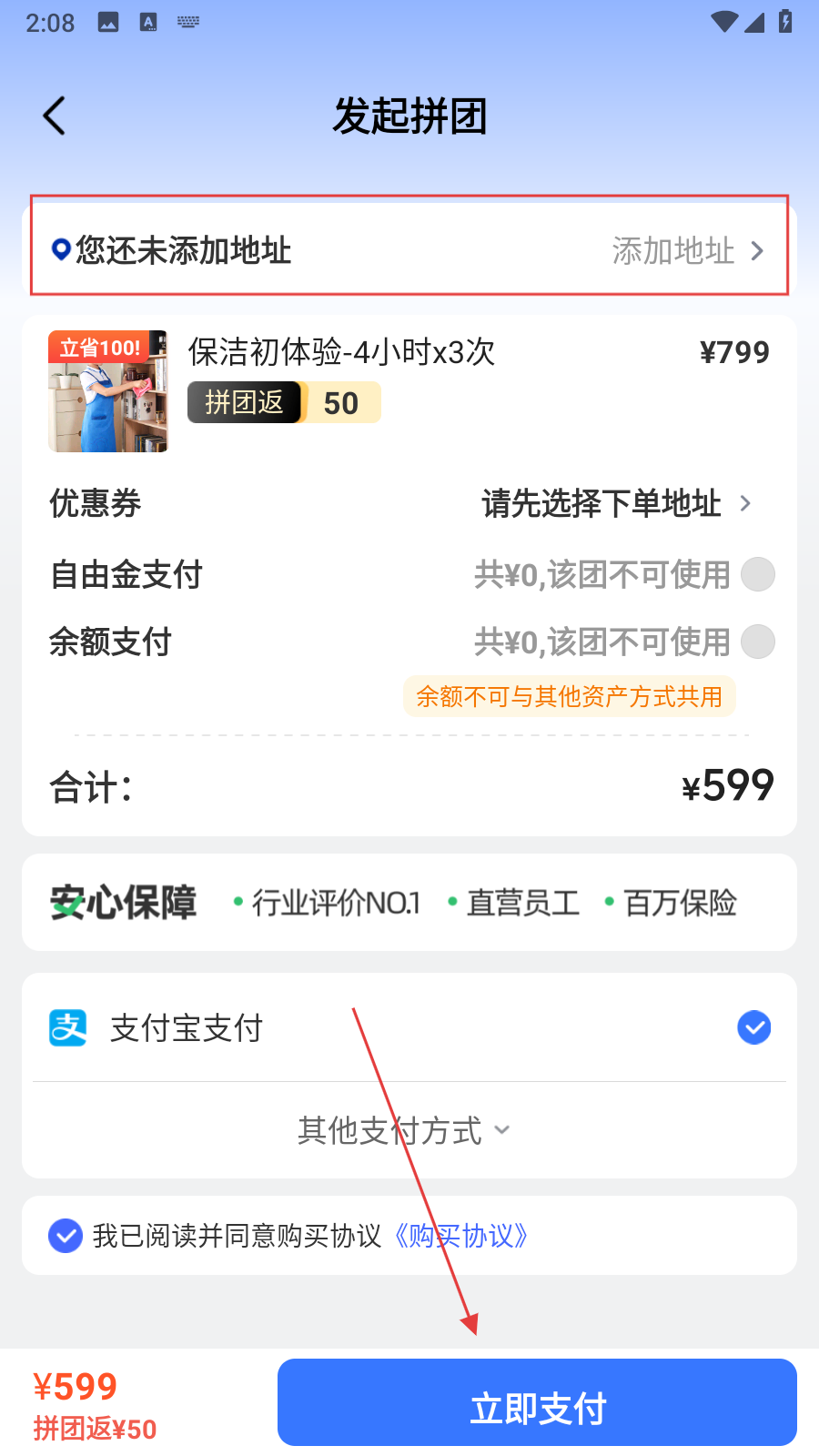 4、在發(fā)起拼團頁面,先添加下單地址,然后點擊立即支付。