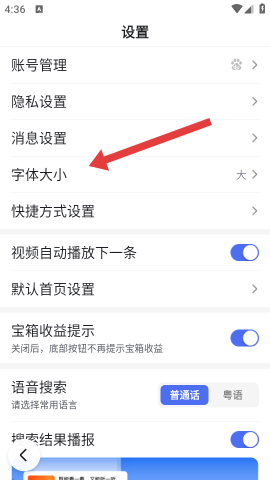 2、如果選擇進(jìn)入設(shè)置的頁面中,需要點擊字體大小的選項,然后進(jìn)入字體大小設(shè)置的界面。