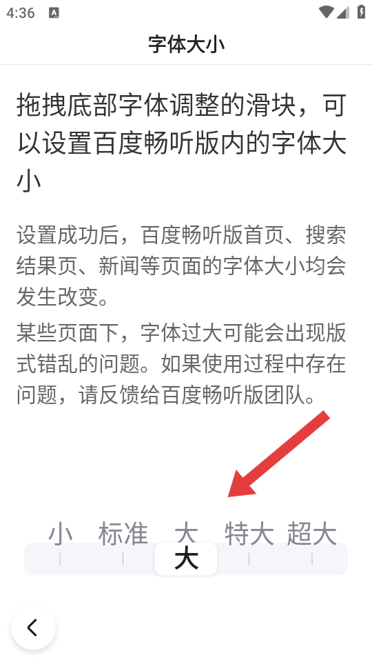 3、在字體大小的設(shè)置頁面里,拖動底部字體調(diào)整的滑塊,即可設(shè)置百度暢聽版內(nèi)的字體大小。