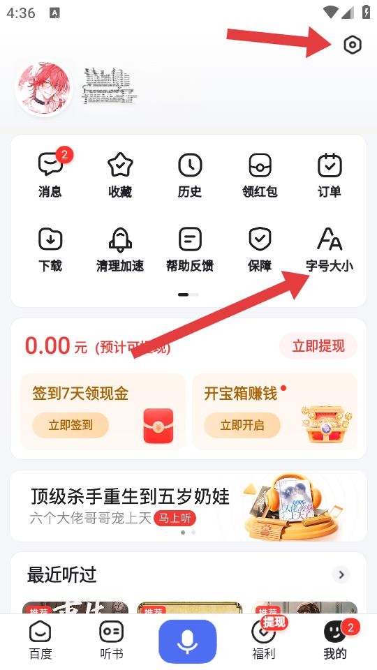1、打開百度暢聽版我的頁面,可以選擇點擊右上角的設(shè)置圖標(biāo),或者直接點擊字體大小圖標(biāo)進(jìn)入。