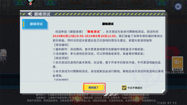 1、進入到游戲內之后,將會有著一個測試信息界面,玩家看完后點擊【我知道了】按鈕即可;