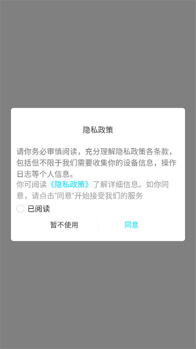 1、打開(kāi)軟件之后閱讀隱私政策和用戶協(xié)議,點(diǎn)擊同意之后就能進(jìn)入到軟件;