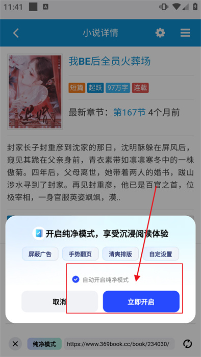 4、選擇任意一個網(wǎng)站進(jìn)入其中會彈出純凈模式,這樣閱讀可以讓畫面更加清爽,點擊【立即開啟】,如下圖;