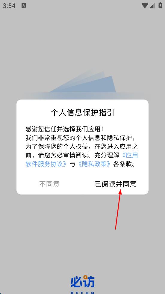 1、打開必訪APP,出現(xiàn)個人信息保護(hù)指引彈窗,仔細(xì)閱讀內(nèi)容后,點擊已閱讀并同意按鈕。