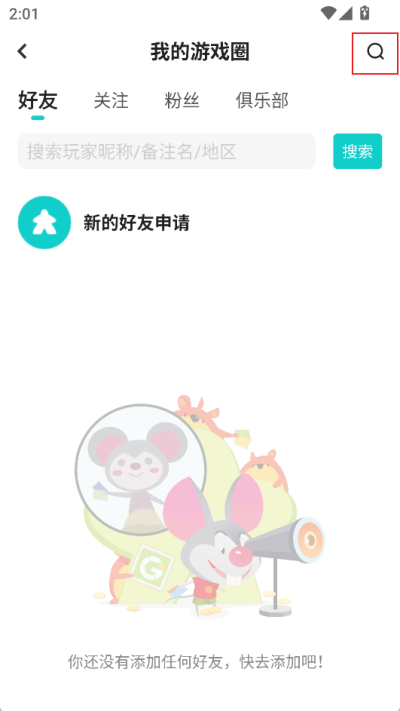 3、點擊后進入好友功能界面,在這里可以查看已經(jīng)添加的好友,點擊右上角的搜索功能選項;