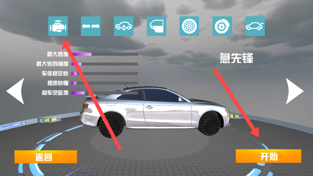 2、賽前裝備界面,上方可以改裝各種汽車部件,然后點(diǎn)擊下方開始駕駛。