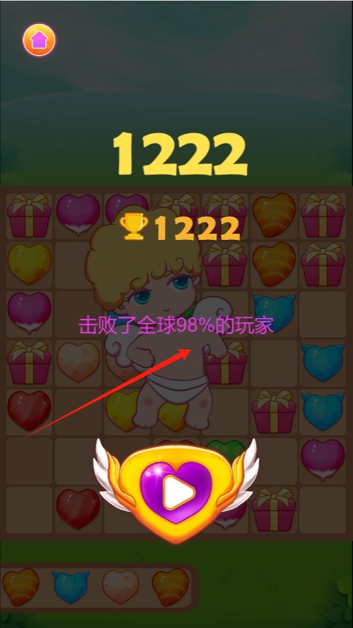 4、關(guān)卡目標(biāo)達(dá)成:根據(jù)每關(guān)目標(biāo)如消除特定顏色糖果、解救指定數(shù)量丘比特等,制定消除策略,在限定步數(shù)或時(shí)間內(nèi)完成任務(wù)。