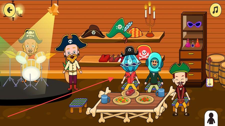 3、在第三個場景,關(guān)注舞臺和餐桌區(qū)域,點擊正在打鼓的角色或餐桌上的食物等,體驗表演和用餐等情節(jié),感受游戲豐富的互動內(nèi)容。
