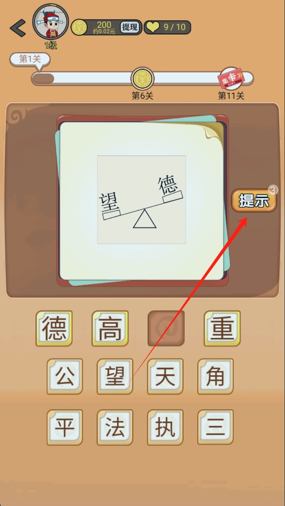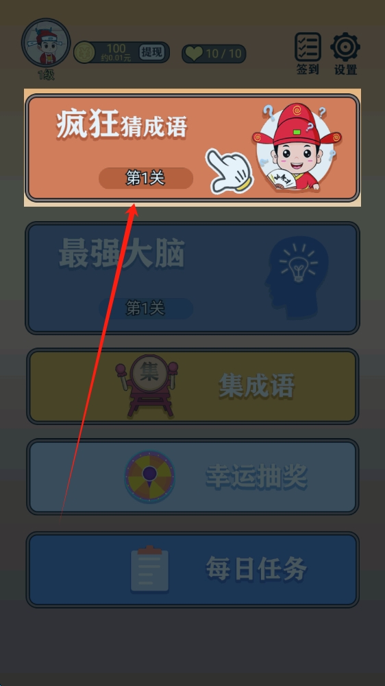 1、點擊選擇第一關,利用每日免費抽獎機會獲取稀有提示道具,如"透視眼"直接顯示部分漢字。