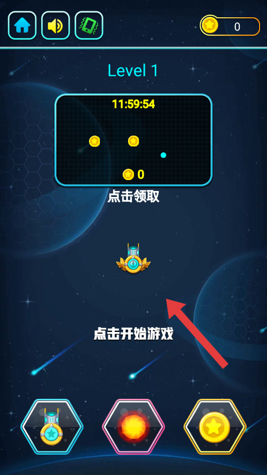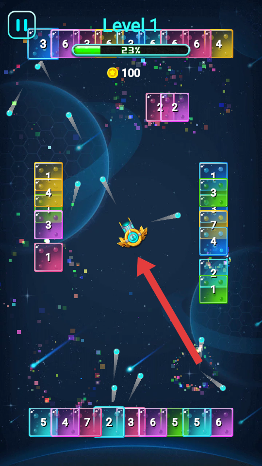 1、進入旋轉(zhuǎn)彈射球的幾何空間,注視著屏幕中央的炮臺,緊盯首波旋轉(zhuǎn)而來的彩色磚塊,點擊發(fā)射子彈開啟首次彈射防御。