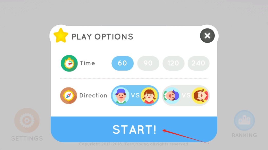 2、在PLAYOPTIONS界面,選擇60秒游戲時(shí)間和對(duì)戰(zhàn)方向,點(diǎn)擊START開啟游戲。