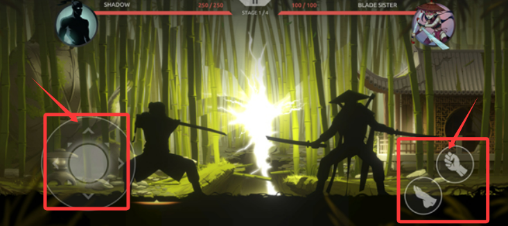 1、進入游戲后,屏幕左邊輪盤控制角色移動,右邊則為拳擊、腳踢等鍵位。