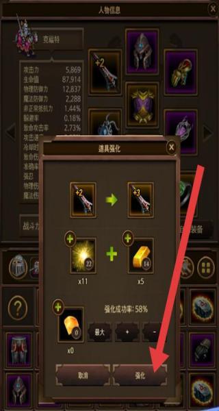 2、在道具強化界面,確認材料(如強化所需物品)充足后點擊【強化】按鈕,嘗試提升裝備屬性,注意強化成功率數(shù)值。