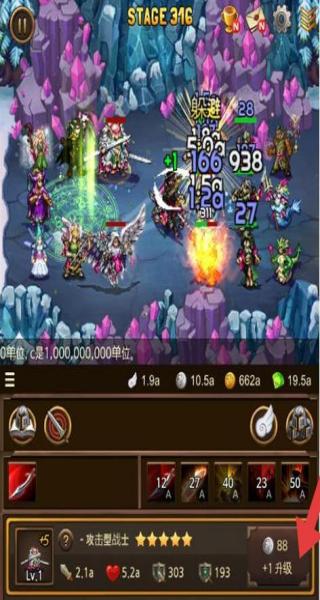 3、戰(zhàn)斗界面中,當角色經(jīng)驗條滿足條件時,點擊【+1升級】按鈕提升角色等級,增強戰(zhàn)斗力以應對【STAGE316】等關(guān)卡挑戰(zhàn)。