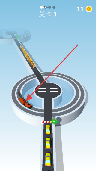 2、在【關卡1】中,駕駛車輛行駛,注意避開賽道上的障礙物(如橙色物體),沿著道路前進,同時收集金幣,提升關卡得分。
