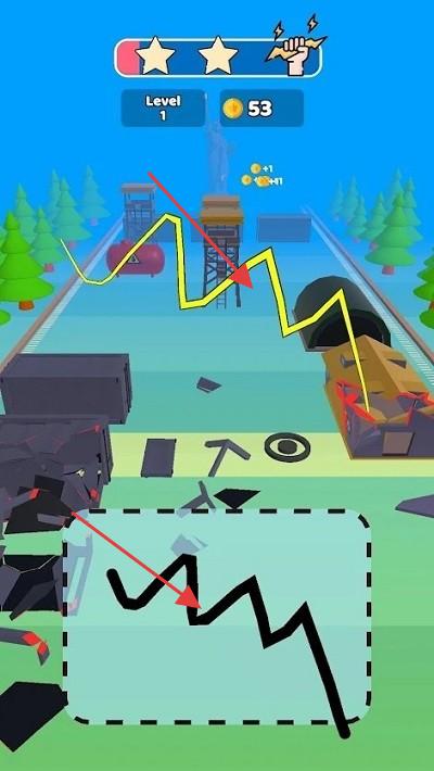 1、玩家在屏幕下方的區(qū)域通過手指繪制線條,規(guī)劃閃電的行進(jìn)路徑,使其擊中場景中的目標(biāo)物體。