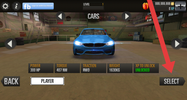 2、在車輛的選擇界面,點擊【SELECT】的按鈕,選擇游戲已解鎖的車輛,進入游戲游玩。