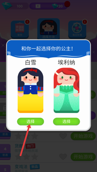 1、在游戲中彈出的公主選擇界面,根據(jù)喜好選擇【白雪】或【埃利納】公主,點擊對應【選擇】按鈕確定角色。