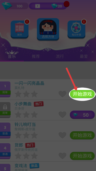 2、進入音樂選擇界面后,在歌曲列表里挑選想聽的歌曲(如【一閃一閃亮晶晶】),點擊右側(cè)的【開始游戲】按鈕進入關(guān)卡。