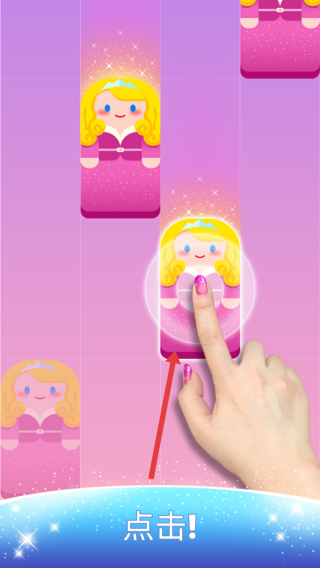 3、進入游戲關(guān)卡后,按照屏幕提示,及時點擊帶有公主圖案的方塊,跟隨音樂節(jié)奏完成游戲操作。