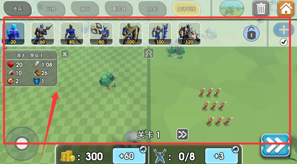 1、進(jìn)入游戲后可以看到敵方的陣營(yíng)情況,來(lái)部署你的隊(duì)伍只需點(diǎn)擊上方的任一兵種,再點(diǎn)擊空白位置即可。