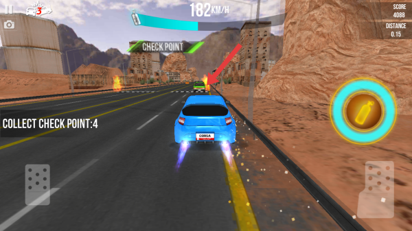 3、在賽道上注意前方【CHECKPOINT】標(biāo)識和車輛障礙,合理操控避免碰撞,確保順利通過檢查點(diǎn)。