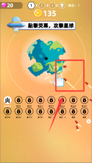 1、游戲開始先從小行星入手,點擊屏幕發(fā)射武器,觀察不同武器的破壞效果,熟悉基本操作和物理特性。