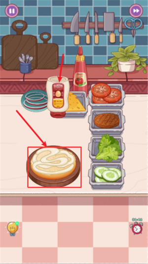 1、關(guān)卡都有著自己獨(dú)特的玩法,例如這一關(guān)就是制作漢堡,首先放沙拉醬。