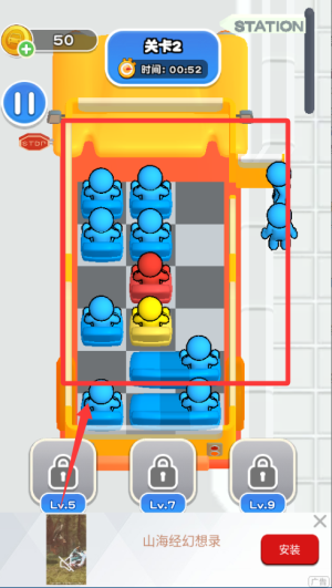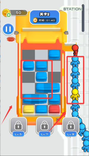 1、基礎(chǔ)操作采用拖拽移動(dòng),玩家需要將乘客拖到對(duì)應(yīng)顏色的座位上,確保移動(dòng)路徑不被其他乘客阻擋。