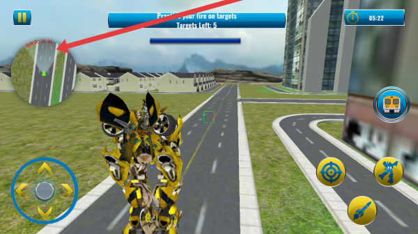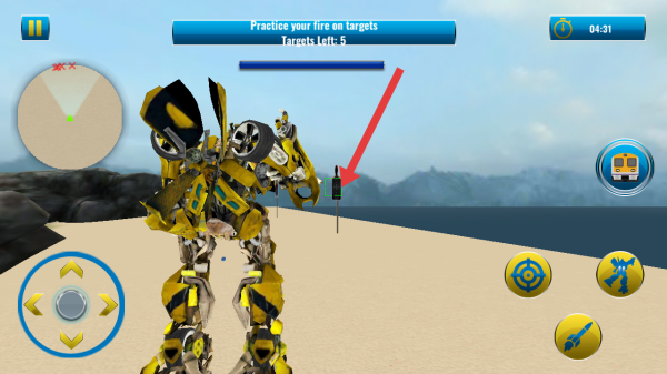2、精準(zhǔn)射擊操作反饋:通過滑動(dòng)屏幕精準(zhǔn)控制大黃蜂準(zhǔn)心,點(diǎn)擊按鈕發(fā)射炮彈導(dǎo)彈,擊中敵人伴隨震動(dòng)反饋與特效,摧毀坦克炮管擊落飛機(jī)引擎,帶來直擊要害爽快打擊感。