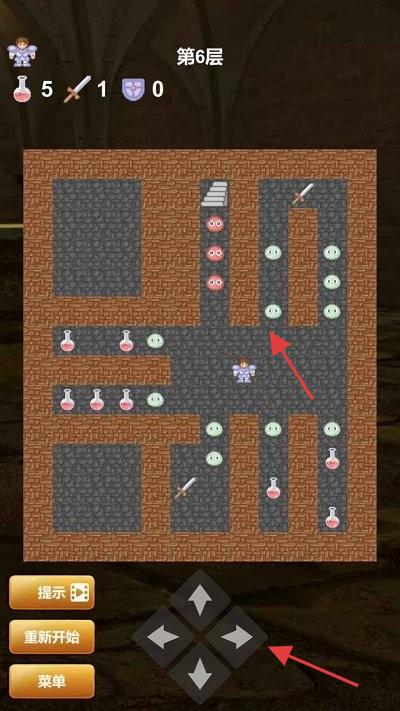 1、爬塔探索操作:點(diǎn)擊屏幕控制英雄移動至樓梯進(jìn)入上層,觸碰怪物觸發(fā)戰(zhàn)斗,自動計算攻防數(shù)值扣除對應(yīng)血量,直至擊敗所有怪物通關(guān)。