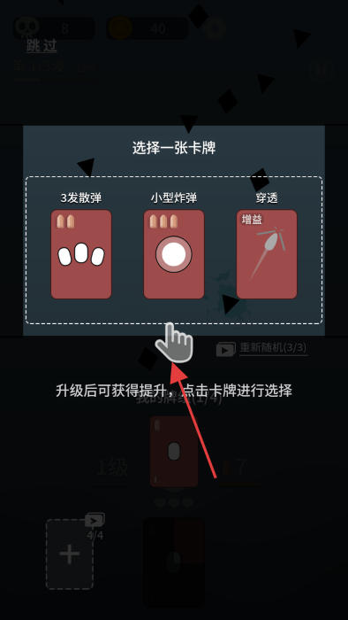 3、卡牌升級(jí)側(cè)重功能性互補(bǔ),如“穿透子彈+暴擊率提升”強(qiáng)化單體輸出,“擊退效果+減速場(chǎng)”構(gòu)建防御縱深,適時(shí)重置卡組優(yōu)化策略。