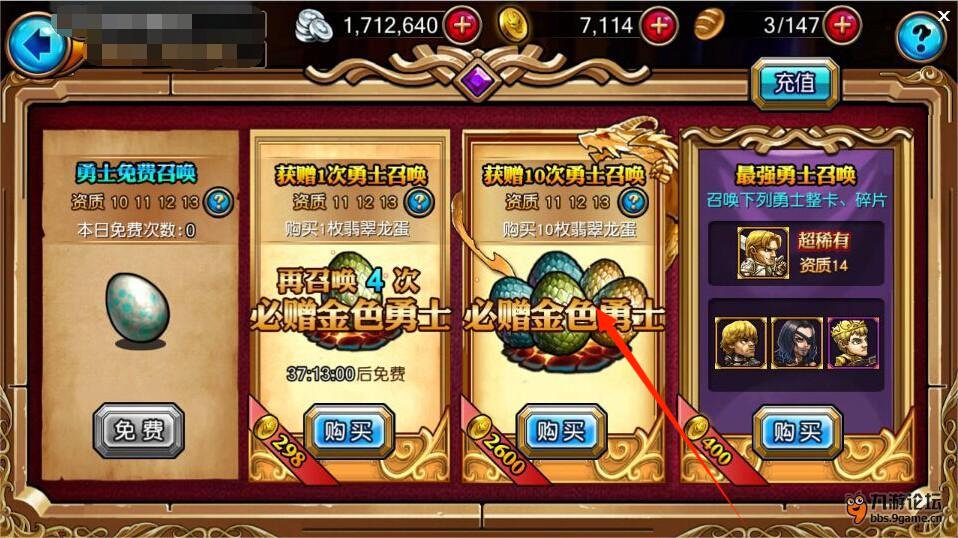 1、查看勇士召喚界面,可選擇免費或付費召喚方式,獲取不同資質的勇士。