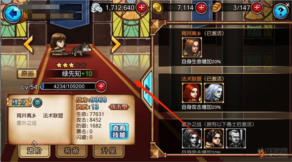 3、點擊具體勇士,查看其屬性和緣分系統(tǒng),激活緣分組合,提升勇士生命、攻擊等屬性。
