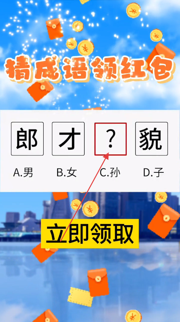 2、給出部分成語(yǔ)字詞和選項(xiàng)如“郎才貌”,選項(xiàng)有A.男、B.女、C.孫、D.子,選正確答案如B成“郎才女貌”,答對(duì)或有獎(jiǎng)勵(lì)。