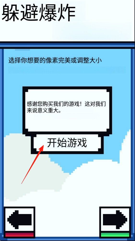 1、在閃避爆破游戲啟動界面,看到感謝語,點擊開始游戲,進入游戲準備環(huán)節(jié)。